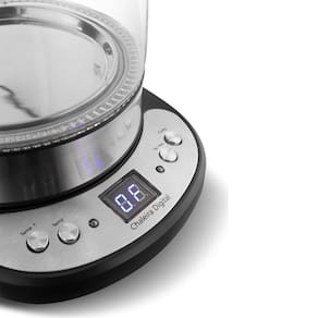 Chaleira Elétrica Philco Digital Glass com capacidade de 1,7 litros, controle de temperatura eletrônico (50 a 95°C), desligamento automático com bipe, base destacável com porta-cordão e jarra de vidro com indicador de nível de água.Características