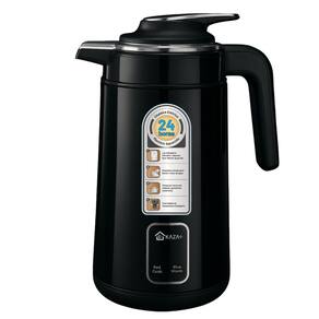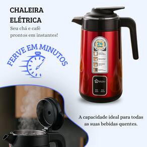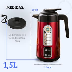 Chaleira elétrica com design moderno em aço inox, capacidade de 1,5L, potência de 1200W, base giratória 360°, desligamento automático e proteção contra superaquecimento. Indicador luminoso de funcionamento.Acessórios
