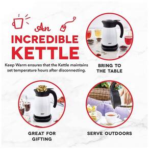 Chaleira elétrica sem fio com controle preciso de temperatura (104-212°F), exterior "Cool Touch" para segurança, capacidade de 1.7L (57 oz), tampa anti-derramamento e base giratória.
