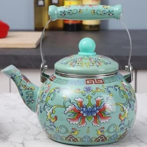 A Chaleira Esmaltada Bule Decorada Artesanal Luxo 2Lts é perfeita para quem busca uma peça de qualidade e com um toque de delicadeza. Com capacidade de 2,300lts, essa chaleira esmaltada é ideal para preparar chás, cafés e outras bebidas quentes. Fabricada em aço esmaltado com pintura eletrostática, essa chaleira possui um acabamento de qualidade, garantindo durabilidade e resistência. Sua tampa decorada com lindas flores pintadas à mão dá um charme especial ao produto, tornando-o uma peça única e exclusiva. Além disso, essa chaleira conta com um difusor, que permite preparar chás diretamente na chaleira, garantindo um sabor mais intenso e agradável. Sua alça em metal também é resistente e proporciona um manuseio seguro e confortável. As dimensões da chaleira são: altura de 18cm com a tampa, 13cm de altura sem a tampa, largura de 16cm e comprimento de 16cm de fundo. A espessura inferior é de 0,60mm. Para garantir o bom funcionamento da chaleira, é importante não ultrapassar o nível máximo de água e evitar que transborde. O líquido deve estar sempre abaixo da capacidade adequada. Essa chaleira esmaltada é importada e possui contra defeitos de fabricação. No entanto, é importante ressaltar que a não cobre defeitos originados por mau uso. Garanta momentos especiais ao preparar suas bebidas favoritas com estilo e elegância. Marca: Não Informado