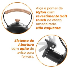 A Chaleira da linha Roma Vintage possui apito que avisa quando o líquido ferver e indica o tempo certo no preparo de seu chá, e seu sistema de abertura com alça de nylon não esquenta e é super fácil de utilizar.