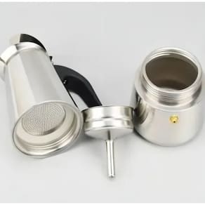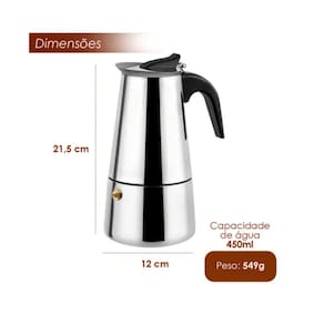 CHALEIRA ITALIANA P BBG-70399 Chaleira Italiana – Tradição e Sabor em Cada Xícara de Café\nPrepare um café encorpado, aromático e cheio de sabor com a Chaleira Italiana, também conhecida como cafeteira moka. Com design clássico e funcionamento simples, ela é ideal para quem valoriza um bom café feito de forma tradicional, no fogão.\nFabricada em alumínio resistente ou aço inox (conforme o modelo), a chaleira italiana utiliza pressão para extrair o melhor do pó de café, proporcionando uma bebida intensa e marcante, no estilo espresso.\nCaracterísticas do produto:\nCapacidade: 6 Xícaras de 300ml\nMaterial: Alumínio ou aço inox\nCabo ergonômico e resistente ao calor\nVálvula de segurança para uso tranquilo\nCompatível com fogões a gás, elétricos e vitrocerâmicos\nFácil de desmontar e limpar\nModo de preparo:\nAdicione água na base inferior até o limite da válvula.\nColoque o café moído no filtro central, sem compactar.\nRosqueie a parte superior e leve ao fogo baixo.\nEm poucos minutos, o café estará pronto na parte superior da chaleira.\nDimensões médias Altura: 16 cm Diâmetro: 8 cm Peso aproximado: 350 gramas\nIdeal para uso diário ou para presentear amantes de café, a Chaleira Italiana é sinônimo de tradição, praticidade e sabor incomparável. Marca: Não Informado