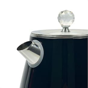 A chaleira é feita de plástico de alta resistência com detalhes em aço inoxidável, garantindo durabilidade e estilo.