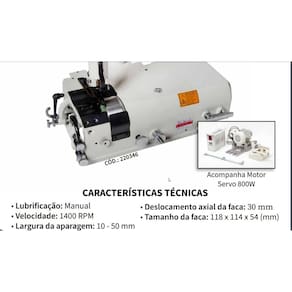 - Lubrificação: Manual. - Velocidade: 1400 RPM - Tamanho da faca: 118 x 114 x 54 (mm). - Largura da aparagem: 10 - 50 mm. - Espessura: 50 mm. - Tamanho da faca: 118 x 114 x 54 (mm). – Deslocamento axial da faca: 30 mm. Enviado por Transportadora, montagem a cargo do comprador