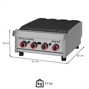 DESCRIÇÃO - Construída totalmente em aço inox, a Char Broiler CHB 60 G2 oferece alta resistência e fácil higienização. - Seus queimadores esmaltados garantem maior durabilidade, enquanto o acendimento por botão centelhador a pilha dispensa energia elétrica. - Os difusores de calor em ferro fundido proporcionam aquecimento rápido e uniforme. - Com registros de gás industriais tipo borboleta e grelhas em ferro fundido com angulação ideal, assegura grelhados perfeitos e escoamento eficiente da gordura. - Conta ainda com coletor superior com dreno e bandeja inferior que ocupa toda a base, facilitando a remoção de resíduos.