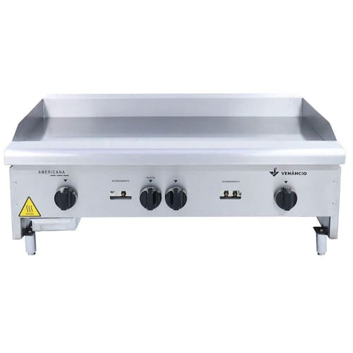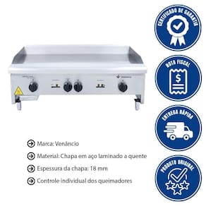 - Transforme o seu negócio com a Chapa Americana Venâncio CG90! Com 90cm de largura e espessura de 18mm, ela oferece uma superfície robusta para preparar alimentos com rapidez e eficiência.