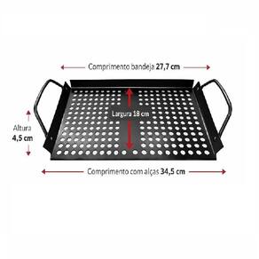 ESPECIFICAÇÕES TÉCNICAS DO PRODUTO: Produto: Bandeja Grill para Churrasqueira | Cor: Preto | Material: Aço inox | Altura: 4,5 cm | Largura: 18 cm | Comprimento: 27,7 cm | Conteúdo da embalagem: 1 bandeja grill preta.