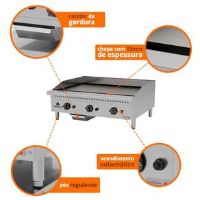 A versatilidade da Chapa Progás também se destaca, com pés reguláveis que permitem adaptação a diferentes superfícies e a opção de conversão para gás natural. Com seu design pensado para facilitar a rotina, ela é ideal para cozinhas que priorizam eficiência e praticidade no preparo de refeições rápidas e grelhadas em grande escala. Este equipamento é perfeito para atender as demandas de estabelecimentos com grande fluxo de clientes, oferecendo resistência e segurança no uso diário.