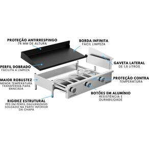 Fabricadas em aço inox escovado, elas possuem botões reguláveis em alumínio da vazão de gás, gaveta coletora de óleo na lateral e queimadores em alumínio que não enferrujam e borda antirrespindo de 7,4 cm de altura.