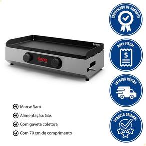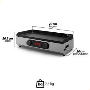 - Com 70cm de área útil, a gás GLP de baixa pressão, ela é perfeita para preparar lanches, bifes e sanduíches com agilidade e sabor profissional.