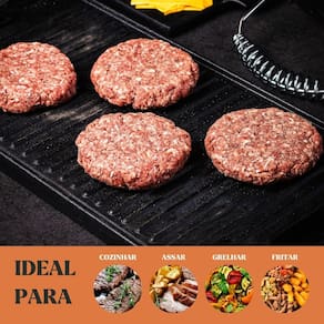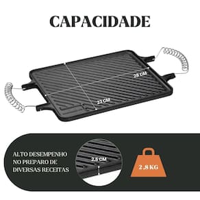 Modelo: Chapa Dupla Face Retangular Alça Espiral 28x23x2,5cm Material da peça: ferro fundido Material da alça: ferro espiral Medidas: 28 × 23 × 2,5 cm Peso aproximado: 2,63 kg Compatível com fogão: indução, gás, elétrico, vitrocerâmico, lenha, forno Já vai curada. Pronta para uso Revestimento atóxico camada protetora Garantia: 90 dias contra defeitos de fabricação A Chapa Dupla Face Panela Mineira oferece duas superfícies em um único produto: lisa para selagens uniformes e estriada para grelhar com marcas tradicionais. A alça espiral em ferro amplia a resistência térmica e o controle no manuseio. Compacta e eficiente, é ideal para cozinhas profissionais e domésticas. Ideal para bares, hotéis, pousadas, restaurantes, buffets e uso diário. CONTEÚDO DA EMBALAGEM 1x Chapa Dupla Face Retangular Alça Espiral 28x23x2,5cm CUIDADOS APÓS O USO Seu utensílio já vai curado, pronto para uso. Após utilizar: Lave com água e sabão neutro, usando esponja ou escova macia Se necessário, ferva com água e detergente para eliminar resíduos Seque ao fogo até eliminar toda a umidade Guarde em local seco e arejado CURA DO PRODUTO O ferro fundido pode oxidar com o tempo. Se isso acontecer, siga este processo: Lave com água, sabão e escova até remover resíduos ou ferrugem Seque ao fogo até eliminar a umidade Aplique uma fina camada de óleo em toda a peça Leve à chama direta por até 15 minutos ou ao forno a 250 °C por 1 hora (de cabeça para baixo) Se a peça tiver partes de madeira, faça a cura apenas na chama direta Sempre remover peças de madeira antes de levar ao forno Repita se necessário