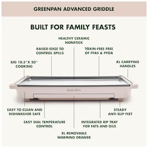 Prepare desde banquetes de café da manhã até jantares gourmet e muito mais com esta chapa elétrica. Graças ao revestimento cerâmico antiaderente e saudável da GreenPan, você pode cozinhar sem preocupações e sem PFAS, PFOA, grafite e cádmio. Com sua superfície de cozimento de 10,5x20, esta chapa está pronta para preparar panquecas, hambúrgueres, fajitas e muito mais. Além disso, a gaveta aquecida removível mantém sua comida quente e pronta até você terminar de cozinhar. O revolucionário revestimento cerâmico não aderente da GreenPan é livre de PFAS, PFOA, grafite e cádmio, proporcionando refeições sem preocupações. Projetado para resistir ao uso em eletrodomésticos modernos, é resistente, fácil de limpar e não se degrada como os revestimentos tradicionais. Com controle de temperatura simples, gaveta aquecida removível e fácil limpeza, esta chapa elétrica é a solução perfeita para refeições práticas e saudáveis.