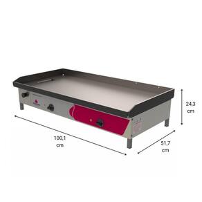 Características Técnicas: Chapa: 98,5x48,5cm Espessura da chapa de 6,3 mm Estrutura em aço inox escovado Chapa para fritura reforçada e inteiriça Aquecimento através de resistências elétricas blindadas Controle de temperatura através de termostato Lâmpada piloto indicando a função liga e desliga a resistência Imagens meramente ilustrativas. **