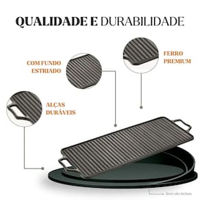 Modelo: Chapa Estriada Retangular Alça de Ferro 70x30x2,5cm Material da peça: ferro fundido Material da alça: ferro Medidas: 70 × 30 × 2,5 cm Peso aproximado: 12,6 kg Compatível com fogão: indução, gás, elétrico, vitrocerâmico, lenha, forno Já vai curada. Pronta para uso Revestimento atóxico camada protetora Garantia: 90 dias contra defeitos de fabricação A Chapa Estriada Panela Mineira proporciona grelhados com marcas tradicionais, realçando sabor e textura. Ideal para carnes, linguiças, filés, legumes e hambúrgueres. O ferro fundido puro garante calor uniforme e vedação perfeita, produzindo resultados profissionais em qualquer ambiente. Ideal para bares, hotéis, pousadas, restaurantes, buffets e cozinhas de alta demanda. CONTEÚDO DA EMBALAGEM 1x Chapa Estriada Retangular Alça de Ferro 70x30x2,5cm CUIDADOS APÓS O USO Lave com água e sabão neutro Seque ao fogo Aplique óleo Guarde em local seco CURA DO PRODUTO Lave e remova oxidação Seque ao fogo Aplique óleo Aqueça 15 minutos Repita conforme necessário IMAGENS MERAMENTE ILUSTRATIVAS