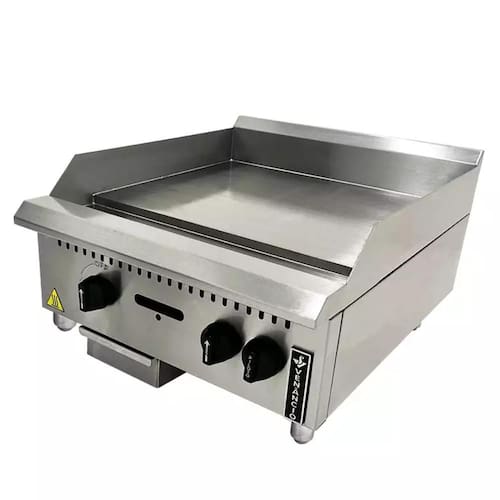 Características Técnicas: Painel e laterais em aço inoxidável Borda anti-respingo em aço inoxidável 2,0 mm Chapa fabricada em aço carbono com espessura de 3/4 (19,05 mm) ou 5/16" (7,94 mm) com superfície polida Chapa soldada às bordas, garantindo estanqueidade ao conjunto Queimador esmaltado à fogo com registro independente, garantindo uniformidade à superfície de trabalho e mais durabilidade Visualização e ajuste dos pilotos feitos através do painel frontal Manipuladores em alumínio injetado e pintados em preto, garantindo maior rigidez e durabilidade Possui registro frontal independente com a função de impedir e liberar a passagem de gás para o piloto Bandeja coletora construída em aço inoxidável de fácil remoção e limpeza Pés de 4" (102 mm) ajustáveis, em aço carbono cromado Consumo: 1,062 kg/h Potência: 11.856 kcal/h Imagens meramente ilustrativas. **