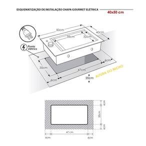 A chapa gourmet atinge temperaturas elevadas, e portanto não deve ser instalada sobre ou próxima de materiais inflamáveis e sensíveis ao calor, como eletrônicos, MDF, MDP, madeiras, laminados, tecidos, couro, plásticos e materiais sintéticos. A instalação deve ser feita em nicho previamente preparado na bancada de pedra (Mármore, Granito, Quartzo, Venato, entre outras), que deve ser cortada com os cantos arredondados para evitar pontos de fragilidade.