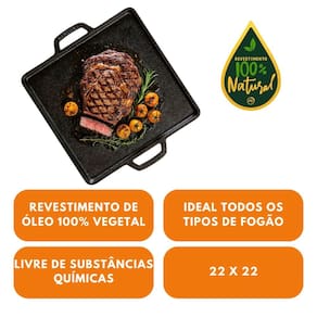 A Chapa Lisa 22x22cm é um utensílio de cozinha que se destaca pela qualidade, resistência e versatilidade no preparo de alimentos. Produzida com revestimento de óleo 100% vegetal através de um processo natural, oferece uma opção mais saudável e sustentável para o uso diário na cozinha.
