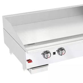 Sua estrutura é totalmente soldada, proporcionando estabilidade, resistência e durabilidade. A frente e as laterais em aço inoxidável, combinadas com a borda anti-respingo e os defletores de aço inoxidável, refletem o calor de forma eficiente, criando uma fonte secundária de calor e aumentando a eficiência térmica. A chapa é equipada com defletores metálicos duplamente soldados, que aumentam a área de contato com a chama em 50%, garantindo um desempenho superior. A gaveta de queimadores independente, em aço inoxidável, facilita a manutenção e aumenta a eficiência do equipamento. Os manipuladores de alumínio injetado com acabamento cromado e proteção em ferro fundido oferecem durabilidade e resistência, enquanto as bandejas coletoras em aço inoxidável, com capacidade de 9 litros cada, são projetadas para fácil remoção e limpeza.