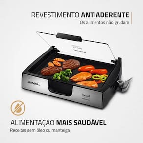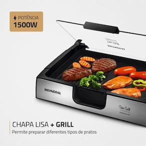CHAPA LISA + GRILL: O Due Grill é composto por chapa lisa e grill e permite preparar diversos tipos de pratos. As chapas são perfeitas para vegetais, pães e carnes. Já o grill é indicado para hambúrgueres e espetinhos.