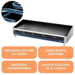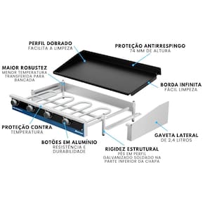 Fabricadas em aço inox escovado, elas possuem botões reguláveis em alumínio da vazão de gás, gaveta coletora de óleo na lateral e queimadores em alumínio que não enferrujam e borda antirrespindo de 7,4 cm de altura.