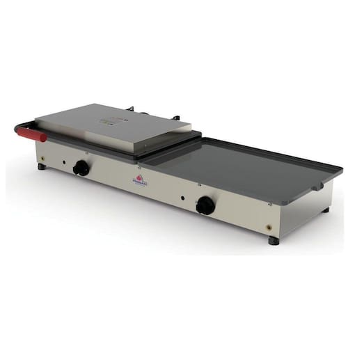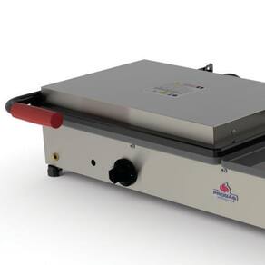 Chapa reforçada para frituras e sanduiches. Produto reforçado. Aquecimento através de resistência elétrica inferior e superior controladas por termostato.