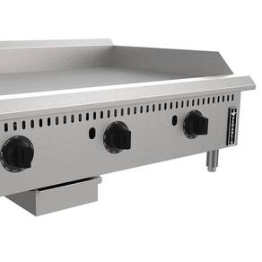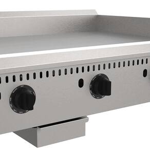 DESCRIÇÃO DA CHAPA TERMOSTÁTICA - Disponível nas larguras de 915 mm - Painel e laterais em aço inoxidável; - Borda anti-respingo em aço inoxidável 2,0 mm; - Chapa fabricada em aço carbono com espessura de 3/4 (19,05 mm) com superfície polida; - Chapa soldada às bordas, garantindo estanqueidade ao conjunto; - Queimador esmaltado à fogo com registro independente, garantindo uniformidade à superfície de trabalho e mais durabilidade; - Controle de temperatura através do termostato (90 C a 290 C); - Sistema de segurança através da válvula termostática, controlada pelos manipuladores; - Manipuladores em alumínio injetado e pintados em preto, garantindo maior rigidez e durabilidade; - Bandeja coletora construída em aço inoxidável de fácil remoção e limpeza; - Pés de 4" (102 mm) ajustáveis, em aço carbono cromado
