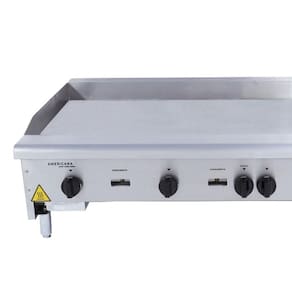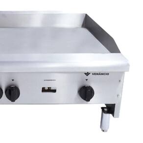 DETALHES - Corpo em aço inoxidável escovado; - Queimadores esmaltados; - Controle individual dos queimadores; - Fácil acendimento através de chama piloto ao lado de cada queimador; - Possui registro independente para chama-piloto; - Chapa em aço laminado a quente com espessura 18mm; - Pés em aço carbono cromado com regulagem de altura; - Limpeza fácil; - Gás GLP (gás GN opcional); - Garantia 3 meses legal mais 3 meses pela fábrica.