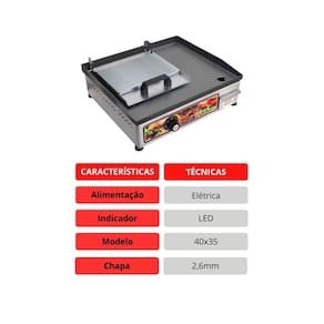 Chapeira Elétrica com Abafador 40x35cm Galvanizada Pratic Se você procura uma chapeira elétrica prática, rápida e eficiente para preparar lanches em casa, essa versão 40x35 é ideal. Compacta e econômica, ela oferece aquecimento uniforme, fácil manuseio e ótimo desempenho no preparo de hambúrgueres, grelhados e porções. Sua estrutura é feita em aço galvanizado, com chapa superior em aço carbono de 2,6 mm, mais resistente a altas temperaturas. A resistência interna é bem distribuída e conta com termostato regulável de 0º a 300?°C, garantindo controle total sobre o preparo. Acompanha abafador, que ajuda a manter o calor e agiliza o cozimento dos alimentos. Possui gaveta coletora de resíduos com puxador, que facilita a limpeza, além de pés antiderrapantes que proporcionam mais segurança durante o uso. O LED indicador mostra quando a chapa está ligada, desligando automaticamente ao atingir a temperatura ideal. Dimensões: 40 cm (largura) x 35 cm (profundidade) x 15 cm (altura) Peso: 7 kg Essa chapeira serve para comércio? Não. É indicada para uso residencial. É antiaderente? Não, mas é fácil de limpar com a gaveta de resíduos e abafador. Qual a voltagem? Disponível em 127?V ou 220?V (escolha no momento da compra). É fácil de usar? Sim, tem termostato de 0 a 300?°C, LED indicador e estrutura segura. Cabe quantos hambúrgueres? Até 4 hambúrgueres de 10 cm por vez. Garantia 3 meses contra defeito de fabricação