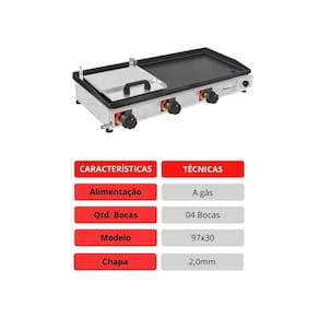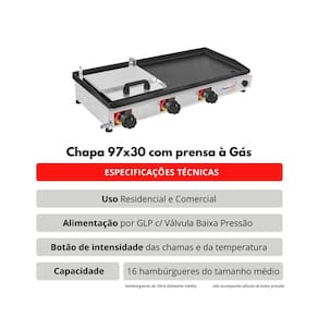 Chapeira Industrial com Prensa à Gás 97x30cm Galvanizada Pratic Se você busca uma chapeira com prensa espaçosa, prática e eficiente para preparar lanches com rapidez, a versão 97x30 é uma excelente escolha. Indicada tanto para uso residencial quanto comercial, ela entrega ótimo desempenho, segurança e economia no preparo de hambúrgueres, porções e grelhados. A estrutura é feita em aço galvanizado, com gaveta coletora de resíduos em inox e base emborrachada para garantir firmeza no uso. A chapa superior em aço carbono aquece de forma uniforme, graças aos 4 queimadores bem distribuídos por toda a extensão da chapa. Acompanha prensa com cabo anatômico, que facilita a finalização dos lanches com praticidade. O acendimento é manual com sistema de gaveta, garantindo mais segurança. Possui controle de temperatura com 5 níveis de ajuste e dois recipientes coletores de resíduos, que facilitam a limpeza após o uso. É potente, durável e pronta para funcionar com gás GLP de baixa pressão. Dimensões: 97 cm (largura) x 30 cm (profundidade) x 15 cm (altura) Peso: 10 kg Essa chapeira serve para comércio? Sim, ideal para lanchonetes, trailers, cafés ou uso residencial intensivo. Funciona com gás de cozinha comum? Sim, utiliza GLP com válvula de baixa pressão (não inclusa). A chapa é antiaderente? Não, mas é fácil de limpar com os recipientes coletores. É fácil de usar? Sim, possui acendimento manual, regulagem da chama e prensa ergonômica. Cabe quantos hambúrgueres? Até 16 hambúrgueres de 10 cm por vez. Garantia 3 meses contra defeito de fabricação