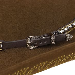 O Chapéu modelo Americano da Mundial é feito de um feltro de alta qualidade, o que o torna durável e resistente às intempéries. Ele apresenta uma aba de 10cm e topo quadrado de 11cm, característicos dos chapéus. A parte interna possui uma faixa de elástico, que ajuda a manter a cabeça no lugar. O chapéu também é decorado com uma bandinha de couro customizada com strass, as abas também são personalizadas com strass, o que adiciona um toque elegante e sofisticado ao design rústico. Com sua combinação de estilo e funcionalidade, este chapéu é a escolha perfeita para cowgirls que buscam uma peça clássica e atemporal para complementar seu visual country.
