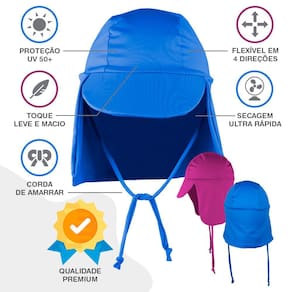 TAMANHOS-Tamanho P (6 meses a 2 anos) - COM cordinha de amarrar;-Tamanho M (2 anos a 6 anos) - COM cordinha de amarrar;-Tamanho G (7 anos a 14 anos) - COM cordinha de amarrar.Confeccionados com tecido muito flexível e confortável, com proteção solar UV 50+, com ergonomia pensada para servir perfeitamente em cabeças infantis e até de adultos (tamanho G), testados e aprovados!Uma das maiores preocupações dos pais, quando levam seus filhos em atividades ao ar livre, são as queimaduras de sol! Com o nosso lindo boné/ chapéu infantil UV 50+, esse problema acabou! Pois ele protege o rosto, as orelhas e a nuca dos pequenos, até embaixo d'água, com muito conforto, deixando os cuidadores despreocupados!Afinal, o que significa Proteção Solar UV50+?UV é a sigla para ultravioleta e 50 +, significa que que 98% dos raios solares são bloqueados, protegendo toda a área de cobertura da cabeça, rosto, orelhas, pescoço e nuca da criança.Tecido com proteção solar UV 50 + PREMIUM, antibacteriano e com Aloe Vera. Proporcionando conforto para os pequenos.Composição do tecido:Malha 90% Poliamida e 10% Elastano (proporcionando elasticidade e um ajuste perfeito para as cabeças infantis). Confeccionado com microfibra de última geração, com toque macio e pigmento, que preserva de forma efetiva, a proteção solar por tempo VITALÍCIO, ou seja, o boné pode ser lavado por infinitas vezes, preservando por todo tempo, a sua finalidade de proteção contra raios solares.Tecido com eficácia comprovada, é submetido a rigorosos testes, realizados por laboratórios credenciados, a fim de comprovar o FPU (fator de proteção ultravioleta).Tratamento Sport Dry com Aloe Vera:Tecnologia inovadora, que permite a absorção do suor, proporcionando um alto frescor à pele sensível das crianças e evitando a proliferação das bactérias causadoras de maus odores.Modo de Lavar:Produto com secagem rápida, deve ser lavado à mão, com sabão neutro e NUNCA com produtos à base de cloro. Não deve ser passado à ferro.