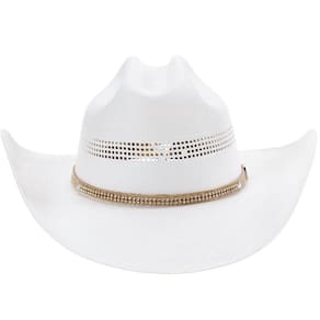 Chapéu Mundial modelo Americano Twister, fabricado com Fibras Têxteis estilo Palha na cor Branca, possui carneira de elástico e bandinha de couro com detalhes em bordado e strass.