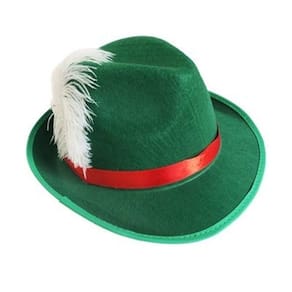 O Chapéu Alemão Verde é ideal para curtir as Festas Nacionais do Chopp que se realizam em nosso país como Munchefest, que é uma festa popular do município de Ponta Grossa, do estado do Paraná ou então a Oktoberfest que é uma festa popular do município de Blumenau, do estado de Santa Catarina. Pode ser também como Chapéu de Robin Hood, aquele arqueiro super humilde das histórias ou também como Chapéu Arqueiro Verde, outro arqueiro inspirado no Robin Hood, dessa vez dos quadrinhos da DC Comics. Possui altura de 12cm e respectivamente dimensões exteriores e interiores de 30cm de comprimento, 26cm de largura e 20cm de comprimento, 17,5cm de largura. Composto em poliéster super resistente que irá durar diversos anos, podendo ser em anos posteriores em ocasiões diferentes. Possui como adorno uma pena branca e fita vermelha de cetim circundando o chapéu Verde Alemão.