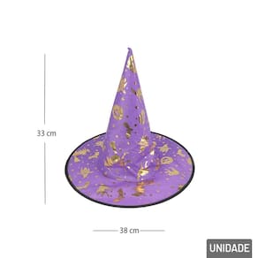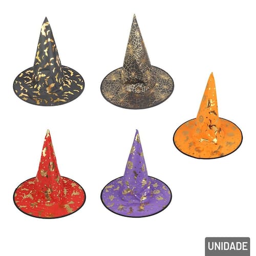 Chapéu de Bruxa Halloween Desenhos Dê um toque de magia e sofisticação à sua fantasia de Halloween com o Chapéu de Bruxa com Desenhos Metalizados! Este chapéu elegante combina o estilo clássico da bruxa com detalhes metalizados deslumbrantes, criando um acessório perfeito para complementar sua fantasia e brilhar nas festas.\nIdeal para festas de Halloween, eventos temáticos, ou qualquer ocasião onde você queira adicionar um toque de glamour e encanto à sua fantasia. O Chapéu de Bruxa com Desenhos Metalizados é perfeito para complementar uma fantasia de bruxa tradicional ou para criar um look sofisticado e festivo.\nDisponivel em cores e modelos.\nEspecificações:\nMarca : TINGS\nTipo de material : Poliéster\nCores ou Estampa :\nDimensões do Produto : 33 X 38 X 38 CM\nDimensões da Embalagem : 1 X 38 X 38 CM\nPeso Bruto (Gramas) : 0.002