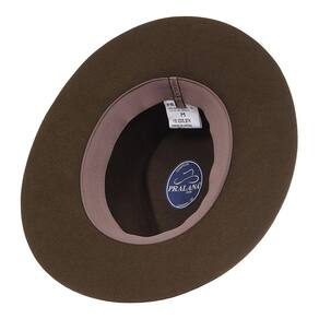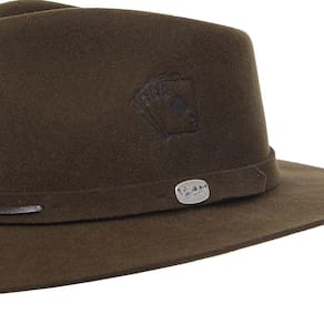 Chapéu Pralana modelo Truco fabricado em Feltro na cor Café, possui aba de 7cm de copa social de 10,5cm, bandinha de feltro com boton de metal e carneira de elástico.