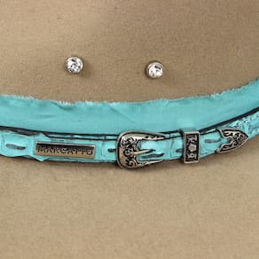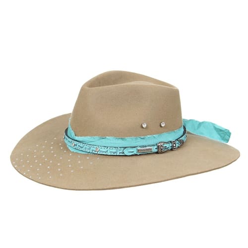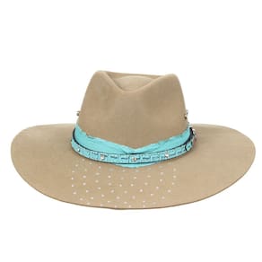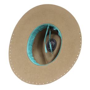Um Chapéu da marca Marcatto modelo Muladeiro, este fabricado em Feltro de alta qualidade na cor Camel, o mesmo possui copa de 11cm e aba de 9,5cm, bandinha de material sintético com botons de metal e strasse carneira de tecido costurado.