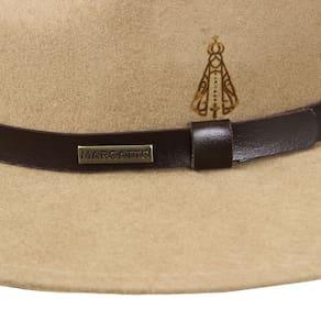 Chapéu Marcatto modelo Cavalgada fabricado em Feltro na cor Caramelo, possui copa de 10,5cm e aba de 6,5cm, bandinha de material sintético com boton, detalhe da imagem de Nossa Senhora Aparecida gravado à laser na lateral e carneira de elástico.