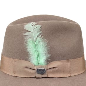 Chapéu da marca Pralana, este fabricado em Feltro de alta qualidade na cor Castor, possui aba de 6,5cm de copa social de 11cm, bandinha de material sintético com pena e boton de metal, também há carneira de elástico.
