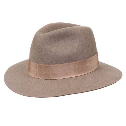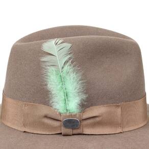 Chapéu da marca Pralana, este fabricado em Feltro de alta qualidade na cor Castor, possui aba de 6,5cm de copa social de 11cm, bandinha de material sintético com pena e boton de metal, também há carneira de elástico.