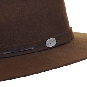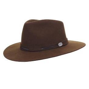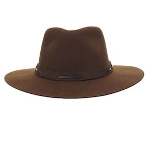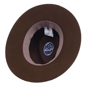 Chapéu Pralana fabricado em Feltro na cor Marrom, possui aba de 7cm de copa social de 10,5cm, bandinha de feltro com boton de metal e carneira de elástico.