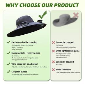 - O chapéu de ventilador movido a energia solar é um chapéu versátil alimentado por energia solar projetado para entusiastas de atividades ao ar livre. Ao integrar ventiladores em ambos os lados da aba, este ventilador de painel solar elimina a necessidade de segurar um ventilador enquanto proporciona um efeito de resfriamento estável e silencioso. Construído com um motor de alta velocidade, o novo chapéu de pesca ao ar livre garante conforto durante atividades como caminhadas, ciclismo ou pesca, permitindo movimentos irrestritos e proteção solar sem esforço.