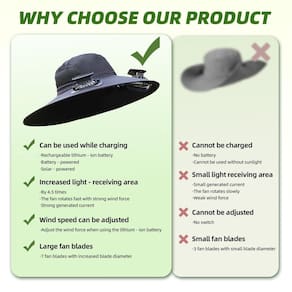 - Este chapéu com ventiladores de energia solar combina conforto e desempenho com seus materiais de alta qualidade, com tecido macio e respirável que absorve o suor e dissipa o calor de forma eficiente. O chapéu solar com ventilador embutido utiliza painéis solares de cristal único para geração de energia confiável, enquanto sua estrutura de PVC leve garante conforto durante todo o dia sem volume. Projetado para uso ativo, o chapéu masculino com ventilador solar proporciona um resfriamento potente enquanto permanece fácil de usar.