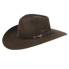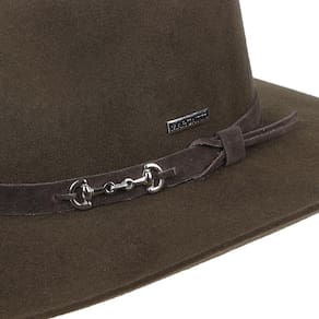 Chapéu Marcatto modelo Cavalgada fabricado em Feltro na cor Marrom, possui copa de 10cm e aba de 9cm, bandinha de material sintético com boton modelo bridão e carneira de elástico.
