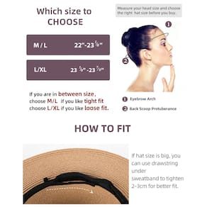 - Dois tamanhos para todos: dois tamanhos são oferecidos para este chapéu de verão; o tamanho M-G é recomendado para circunferência da cabeça em torno de 56,5 a 58 cm e o tamanho G-GG é recomendado para circunferência da cabeça em torno de 58-59,5 cm. Se você achar que está muito apertado ou muito solto, você pode ajustar o tamanho com a alça de ajuste interna; Além disso, um alça de queixo ajustável para segurar no lugar em dias tempestuosos. Faixa interna de suor para ajudar a absorver a umidade durante as estações quentes e úmidas de verão.
