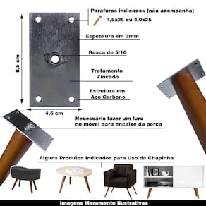 Produtos indicados para fixação da Chapinha:Puff, Aparador, Banco, Poltrona, Sofá, Mesa de centro e Lateral, Home, Rack, Cama Box