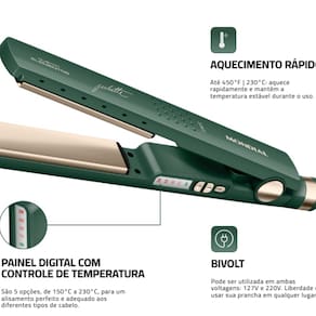 🔥 Painel Digital com Controle de Temperatura: 5 níveis de ajuste (150°C a 230°C) para personalizar o calor ideal conforme o tipo de cabelo — do mais fino ao mais resistente.