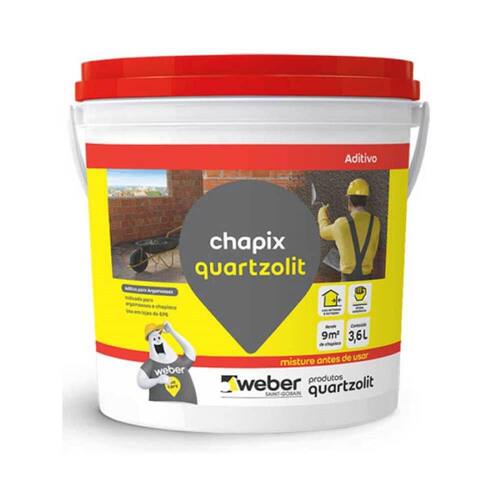 CHAPIX 3,6L QUARTZOLITChapix quartzolit é um aditivo adesivo à base de PVA, desenvolvido para proporcionar melhor aderência e trabalhabilidade para argamassas e chapiscos cimentícios ao substrato.- Chapiscos rolados e comuns- Alta aderência- Isento de cloreto, não agride a armadura- Aplicação sobre concreto, alvenaria e bloco de EPS em tetos de lajes.Beneficios- Facilita a aplicação do chapisco rolado, reduzindo as perdas de material e a geração de sujeira na obra.- Diminui a retração e a permeabilidade de chapiscos e argamassas.- Aumenta a coesão das argamassas.- Reduz a fissuração em argamassas de revestimento.- Pronto para o uso.RendimentoChapisco comum: 2,5m para 1L; 9m para 3,6LChapisco rolados: 2,3m para 1L; 8,2m para 3,6LArgamassa de emboços: 0,6m para 1L; 2,3m para 3,6LMarca: QUARTZOLITCódigo: 78802