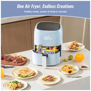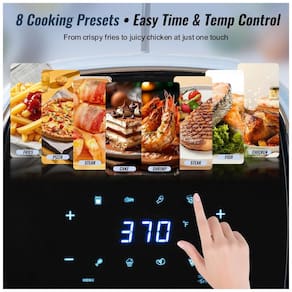 Fritadeira elétrica digital com painel touchscreen e 8 programas pré-definidos. Circulação rápida de ar para textura crocante. Cesto metálico com revestimento antiaderente e partes removíveis compatíveis com lava-louças.Porta-fio