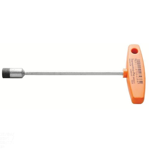 A chave cabo T possui o cabo de plástico injetado no braço curto da chave para ampliar a aplicação de torque.