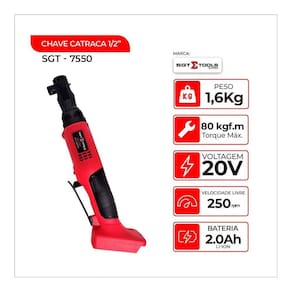 A SGT-7550 é uma chave catraca sem fio, alimentada por uma bateria de íons de lítio de 20V/2Ah. Com um torque máximo de 80Nm, é capaz de realizar trabalhos de aperto e desaperto em parafusos e porcas com facilidade. Possui uma empunhadura ergonômica emborrachada e um gatilho de velocidade variável para controle preciso. Acompanha uma bateria e um carregador de 1 hora, o que permite trabalhar por mais tempo sem interrupções. É um equipamento ideal para mecânicos, marceneiros, eletricistas e profissionais de manutenção em geral.